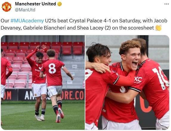 9月28日讯 英超U21职业联赛 第5轮,曼联U21队4-1大胜水晶宫U21队。德瓦尼、比安切里各入一球,谢伊-莱西后备 上场连进两球。