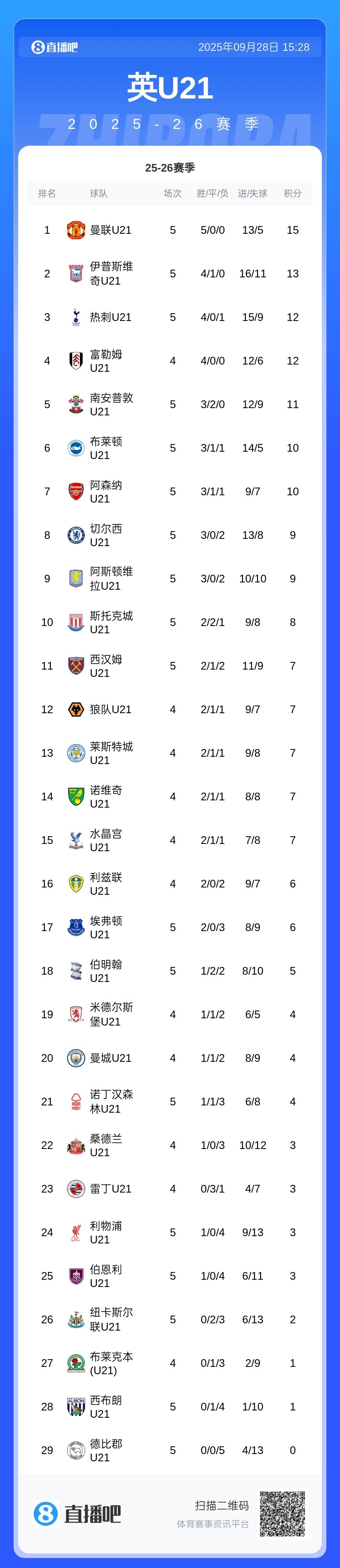 本轮战罢,免费欧洲杯直播曼联U21队在25-26赛季的5场职业联赛 保持全胜,打进13球失5球,暂时领跑积分榜。