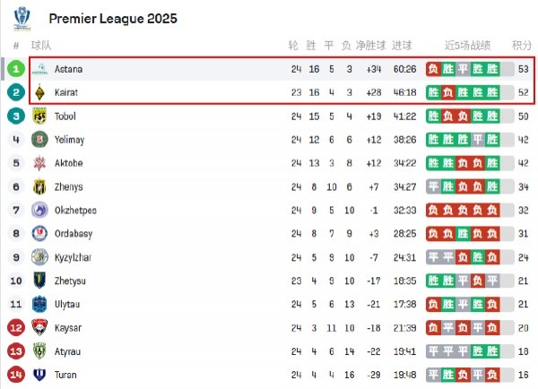 在哈萨克斯坦国内职业联赛 ,阿斯塔纳和阿拉木图凯拉特的角逐 也是非常剧烈 。本赛季踢完24轮后(全年有26轮职业联赛 ),阿斯塔纳拿到53分领跑积分榜。阿拉木图凯拉特少赛一场拿到52分,如果可以赢下剩余的3场赛事 ,他们将会蝉联第一名 哈萨克斯坦国内职业联赛 第一名 。