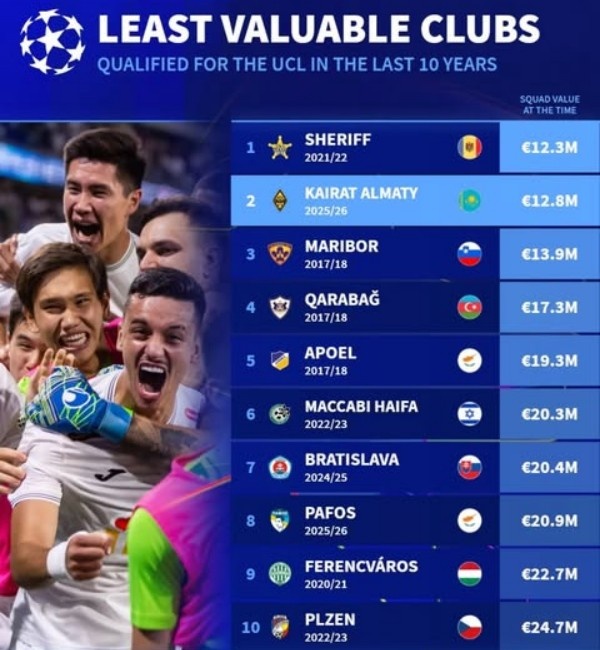 如果用德回转 价来对比,甚至还能更直观。中超球队申花的德回转 价是1383万欧元,打入欧冠正式比赛的阿拉木图凯拉特的德回转 价是1273万欧元。