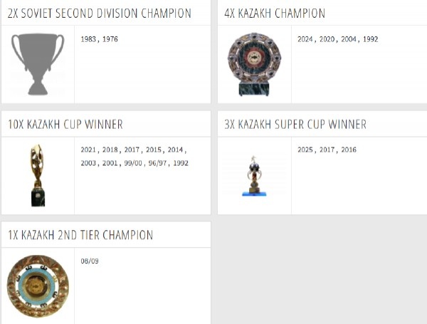 阿拉木图凯拉特一共赢下过4次哈萨克斯坦超级职业联赛 第一名 ,最近的一次是在2024年。他们不只是拿到了职业联赛 第一名 ,还包揽了国内杯赛,成就双冠王。这也是1992年之后,球队再一次取得这样的成就。