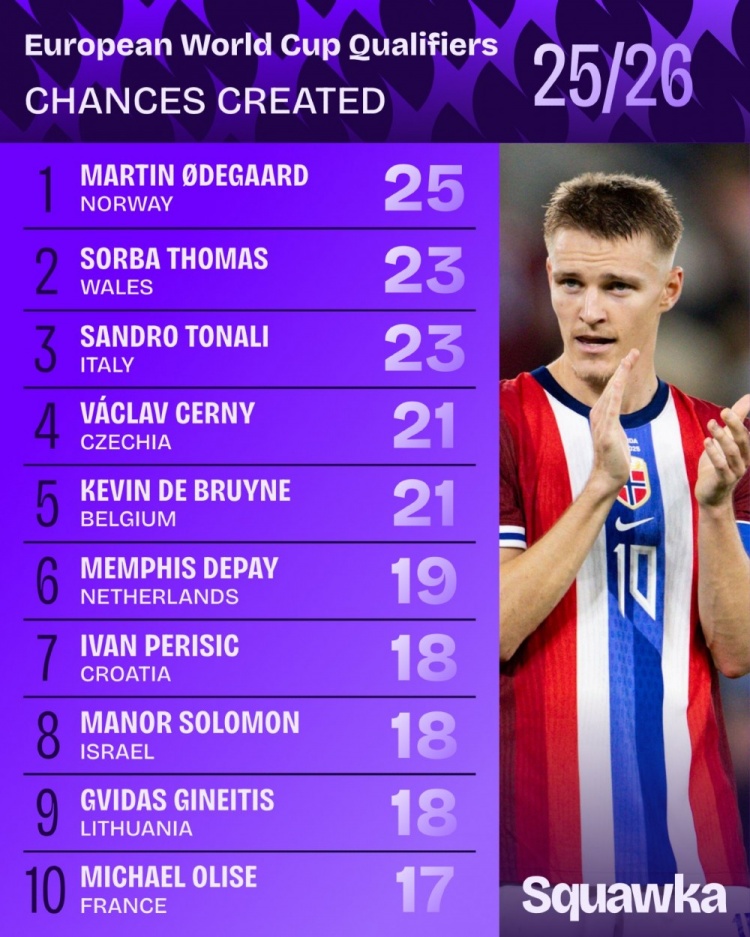 欧洲世预赛创造机会榜:厄德高25次居首,托纳利23次、丁丁21次
