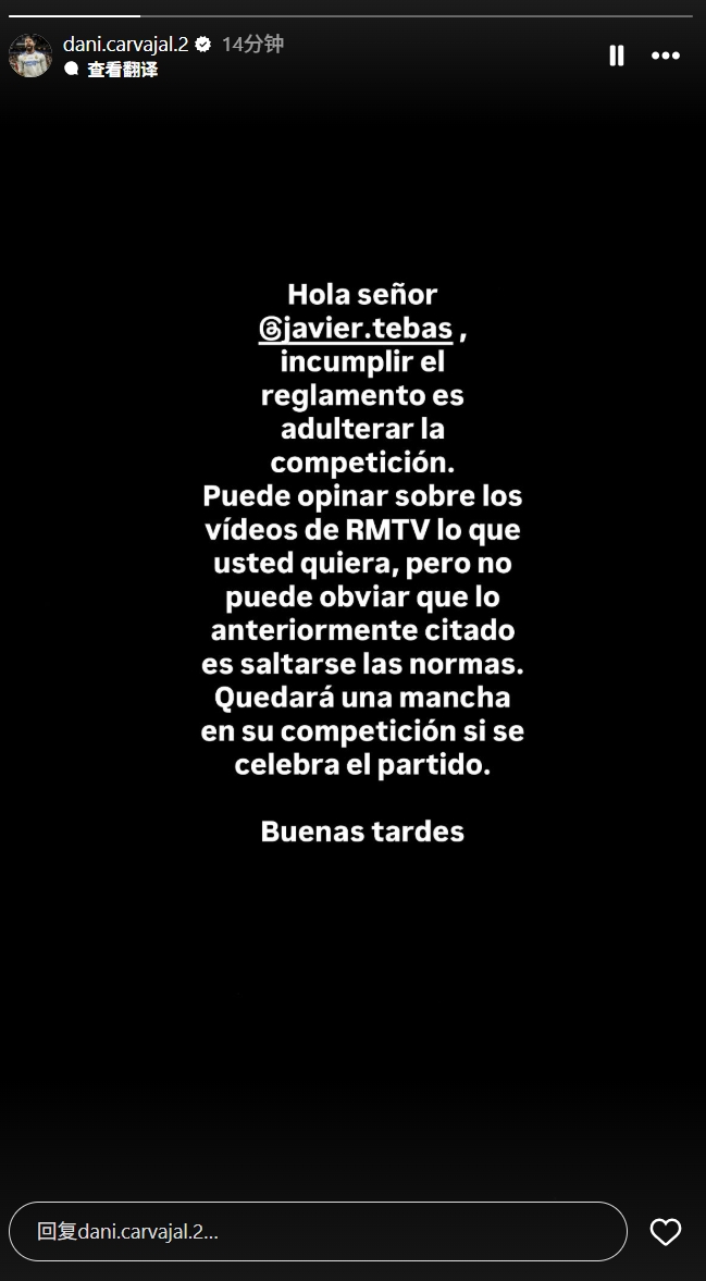 卡瓦哈尔:你好,特巴斯先生。违反规定就是玷污赛事 。你可以对此前皇马TV发布的视频发表你想要说的任何意见。但你不能否认之前所提到的内容(海外赛)就是违反了规则。如果进行海外赛,你的赛事 就会有污点。