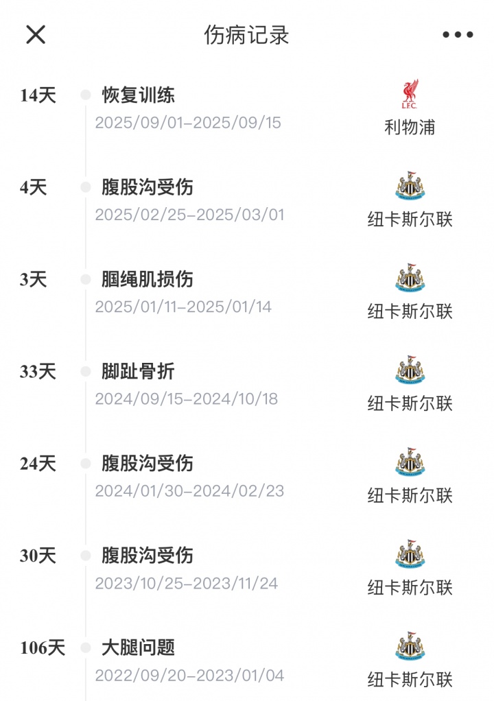 伊萨克此前曾3次遭遇腹股沟伤情↓