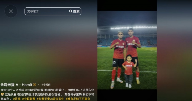 9月28日讯 中超职业联赛 第26轮,长春亚泰主场作战 2-2绝平青岛海牛。赛后,亚泰球员阿不都海米提更新了个人社交媒体。