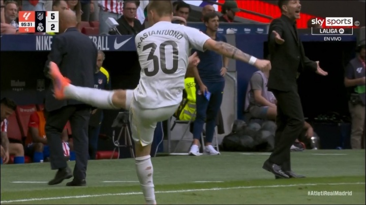 终场前,马斯坦托诺被断球后反抢拉人违例 ,往回走的马斯坦托诺被场外来球砸中,随后他一脚爆射将球踢回场边,引发马竞球员和球迷的不满,双方在最后时刻迸发 冲突,主裁判 也当即向马斯坦托诺出示警告 予以警告。
