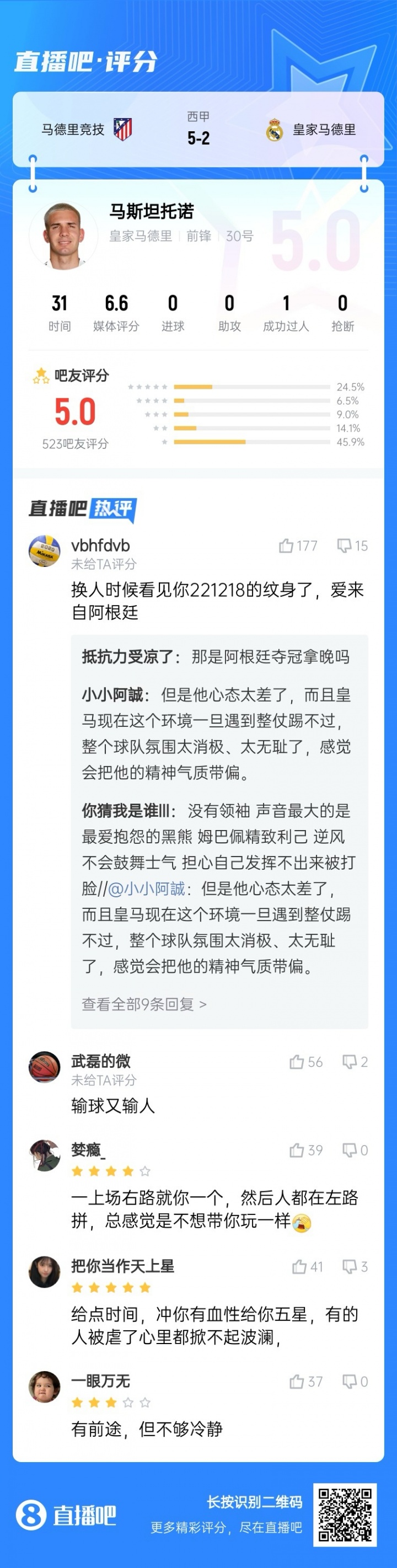 09月28日讯 西甲第7轮,皇马客场应战 2-5大败 马竞,18岁马斯坦托诺后备 出场31分钟,生涯首场马德里德比吞下大败 。