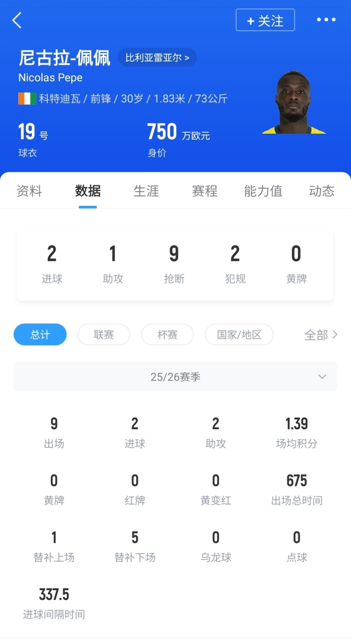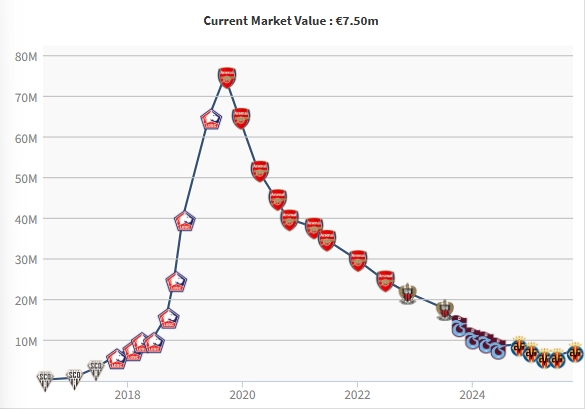 阿森纳第一水货西甲重生💪佩佩身价回涨至750万欧,为巅峰期 1/10