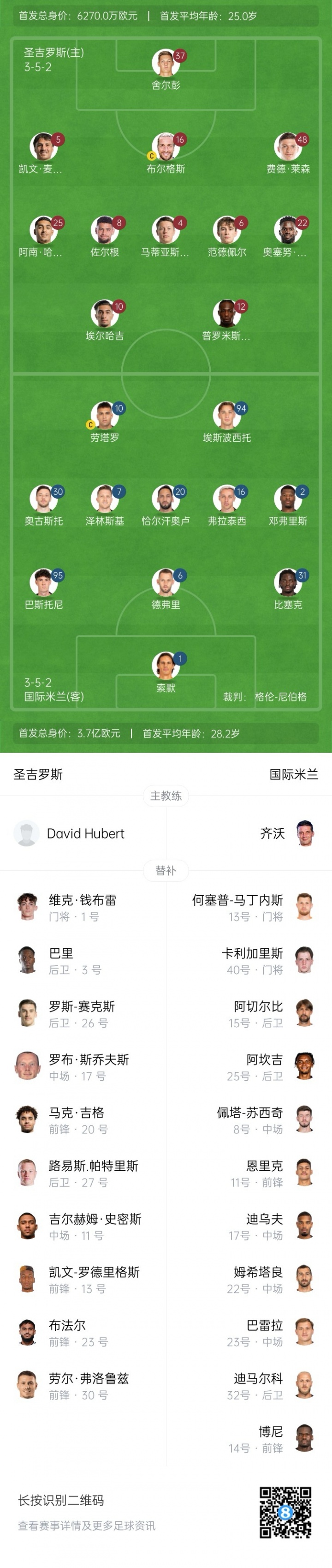 10月22日讯 凌晨03:00,欧冠职业联赛 阶段第3轮,圣吉罗斯主场作战 迎战国际米兰,赛前杆位名单公布。本场赛事 ,免费欧洲杯直播劳塔罗和埃斯波西托搭档锋线,博尼后备 。