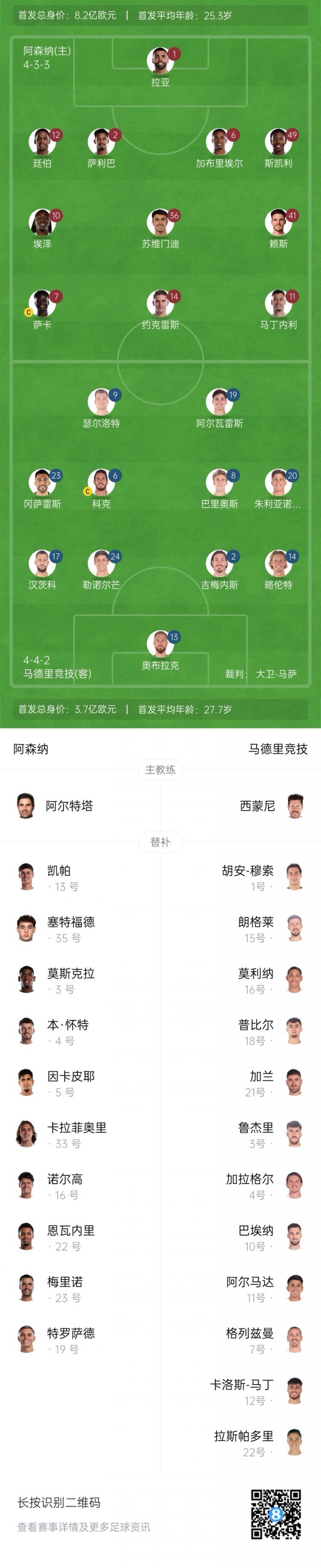 阿森纳vs马竞杆位:约克雷斯PK小蜘蛛,萨卡、马丁内利、埃泽出战