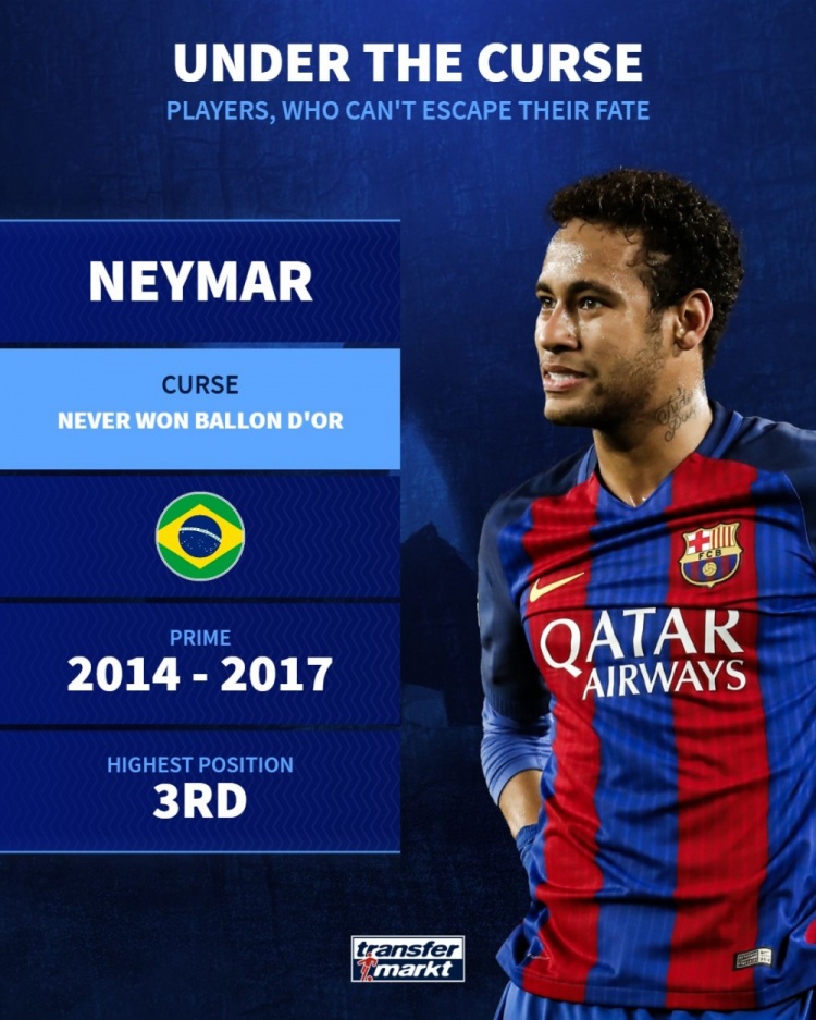 德转盘点“受诅咒”球员:内马尔无缘金球奖、姆巴佩未问鼎欧冠