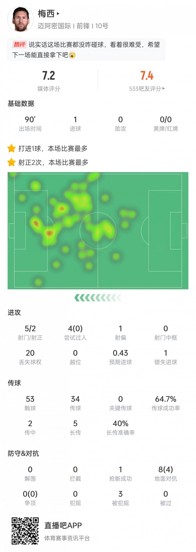 梅西数据:射球 5次打进1球,4次过人0成功+20次丢球权,获评7.2分