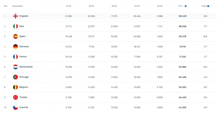 欧战本赛季最新积分:英格兰、德国、葡萄牙前三,塞浦路斯第四!